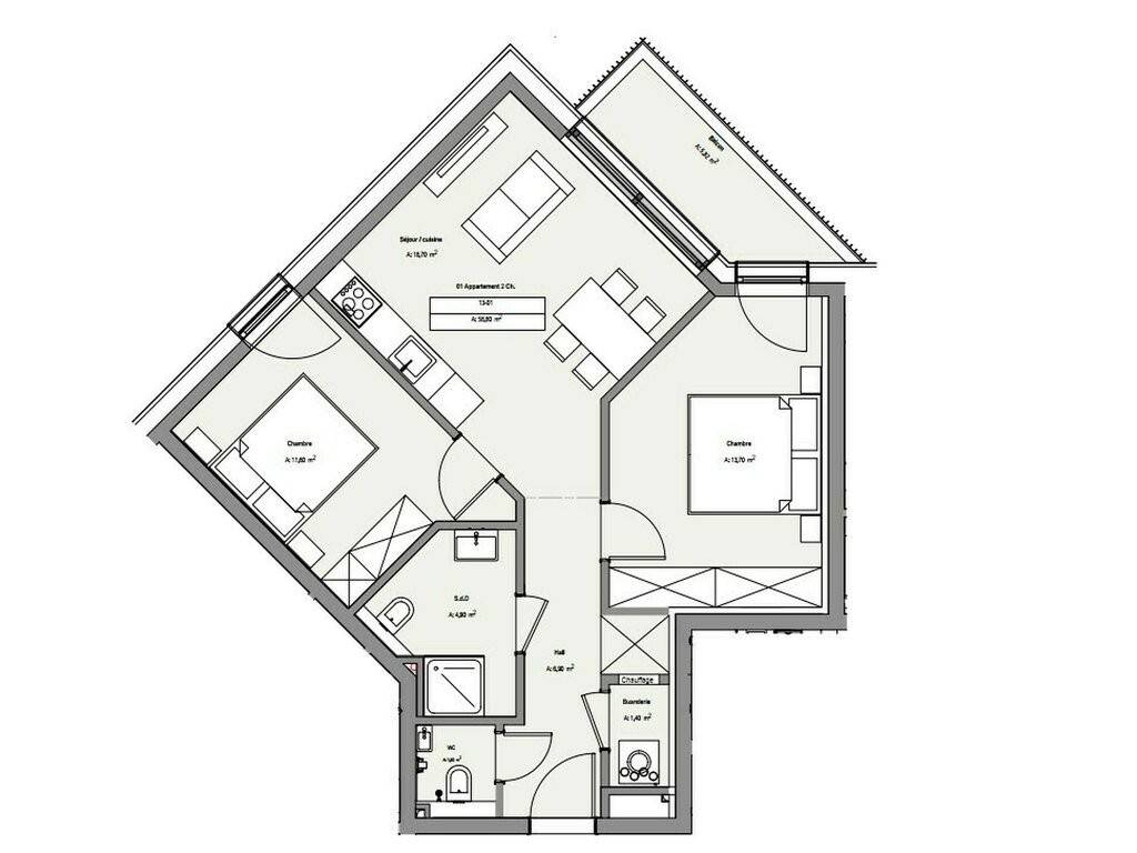 L'appartement A.02.1 se compose d'un hall d'entrée avec coin vestiaire, d'une cuisine ouverte sur le séjour et un balcon attenant, un WC séparé, deux chambres à coucher et une salle de douche. Un débarras avec les raccordements pour installer le lave-linge dans l'appartement.
