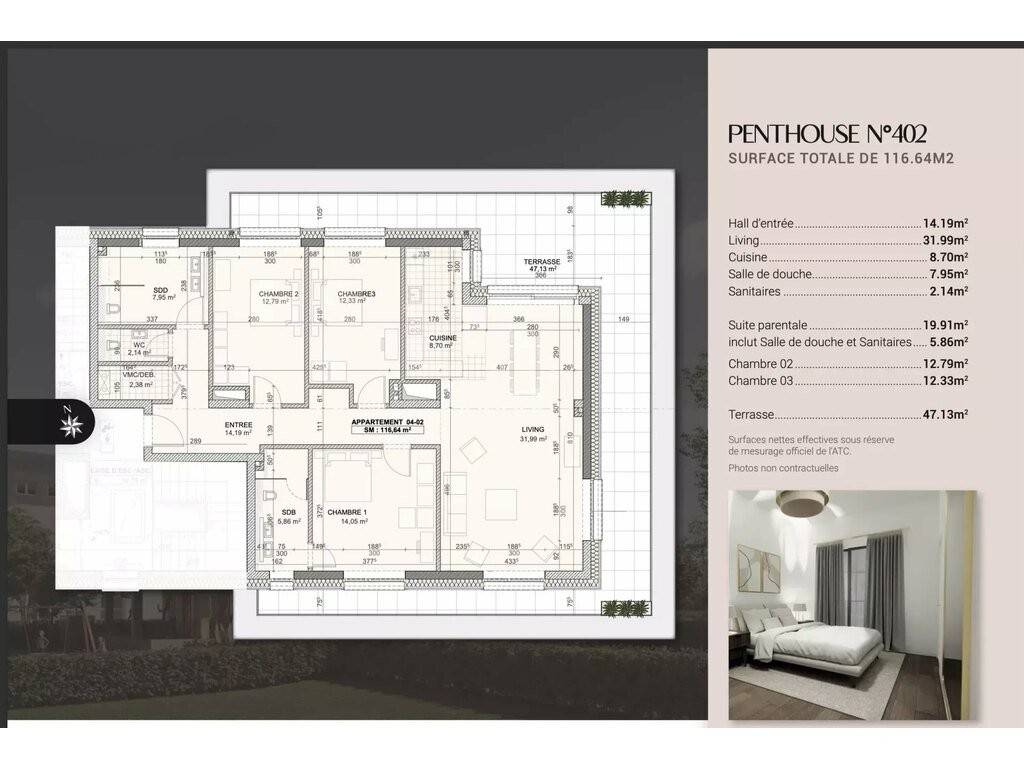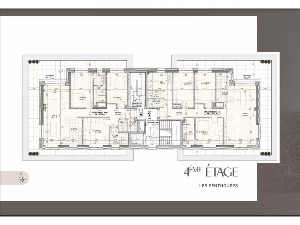 Situé au 4e étage, cet appartement trois chambres dispose d'une surface habitable de 116,64 m2 et d´une grande terrasse de 47,13 m2 qui entoure tout l'appartement avec différents accès.
