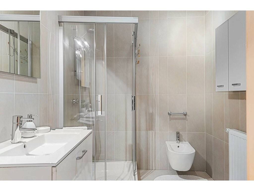 Un couloir avec dressing encastré sur mesure mène à la partie nuit qui se compose d’un palier menant aux deux chambres de ± 12 et 10 m², ainsi qu’à la salle de douche carrelé de ± 7 m² (avec double-vasque, douche, wc suspendu, bidet et sèche-serviettes).