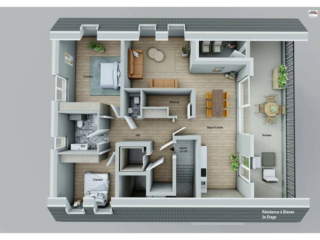 - une 2ième chambre à coucher d’une superficie de 14,98 m2.