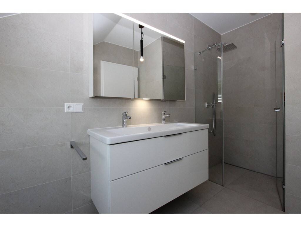 Au premier étage vous disposerez de deux belles chambres à coucher, respectivement de 13,04 m2 et 12,82 m2, d'une salle de bains (lavabo, baignoire et WC) de 6,42 m2, d'un local buanderie avec fenêtre et d'un hall avec coin bureau. En plus, il est possible de doter cet étage d'une terrasse de +/- 16,00 m2 accessible par la deuxième chambre à coucher.