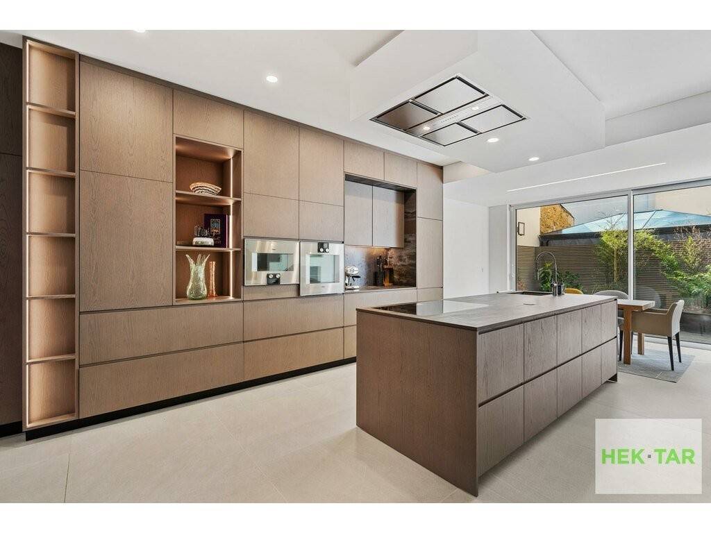 La maison se compose au rez-de-chausée d'un hall d'entrée ainsi qu'une belle cuisine équipée d'appareils électroménagers Gaggenau. Cette cuisine s'ouvre sur un spacieux séjour où le mobilier est entièrement intégré, agrémenté d'une cheminée chaleureuse. De plus, la cuisine donne accès à une charmante terrasse grâce à de grandes baies vitrées.