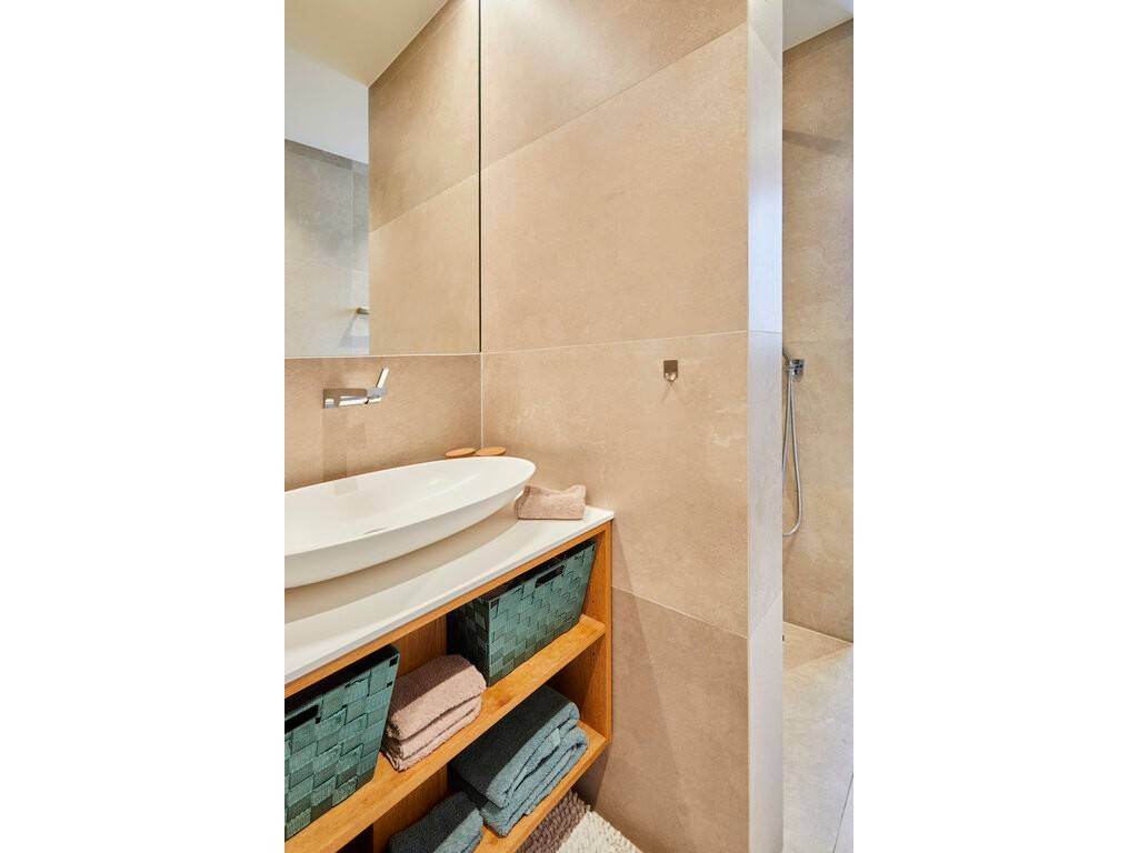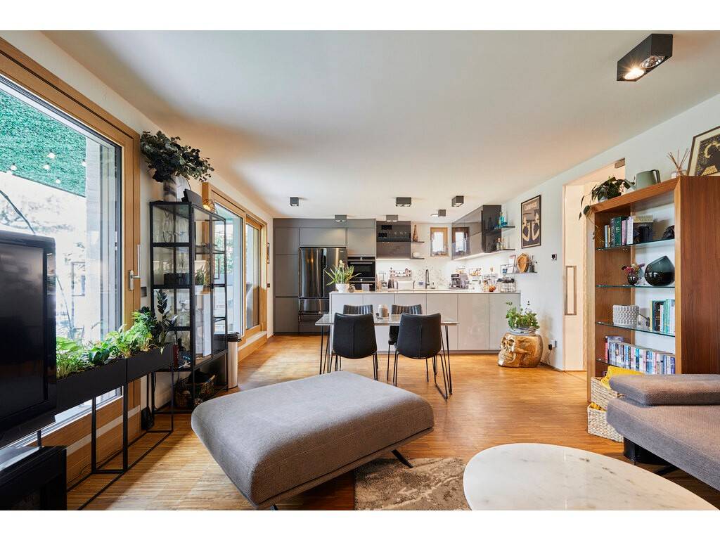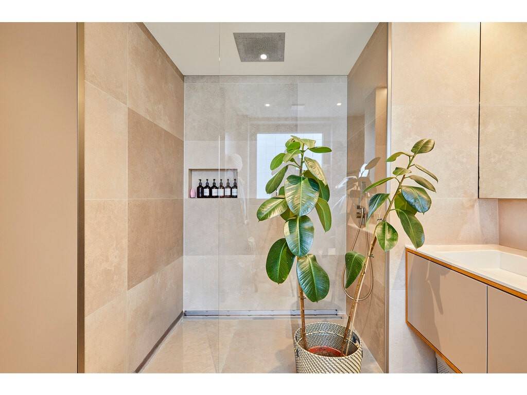 La cuisine, entièrement équipée et ouverte, s'intègre harmonieusement à la pièce de vie qui offre un beau salon et un espace salle à manger. Grâce à de larges baies vitrées, cet espace donne un accès de plain-pied à une vaste terrasse de plus de 57 m², orientée plein sud.