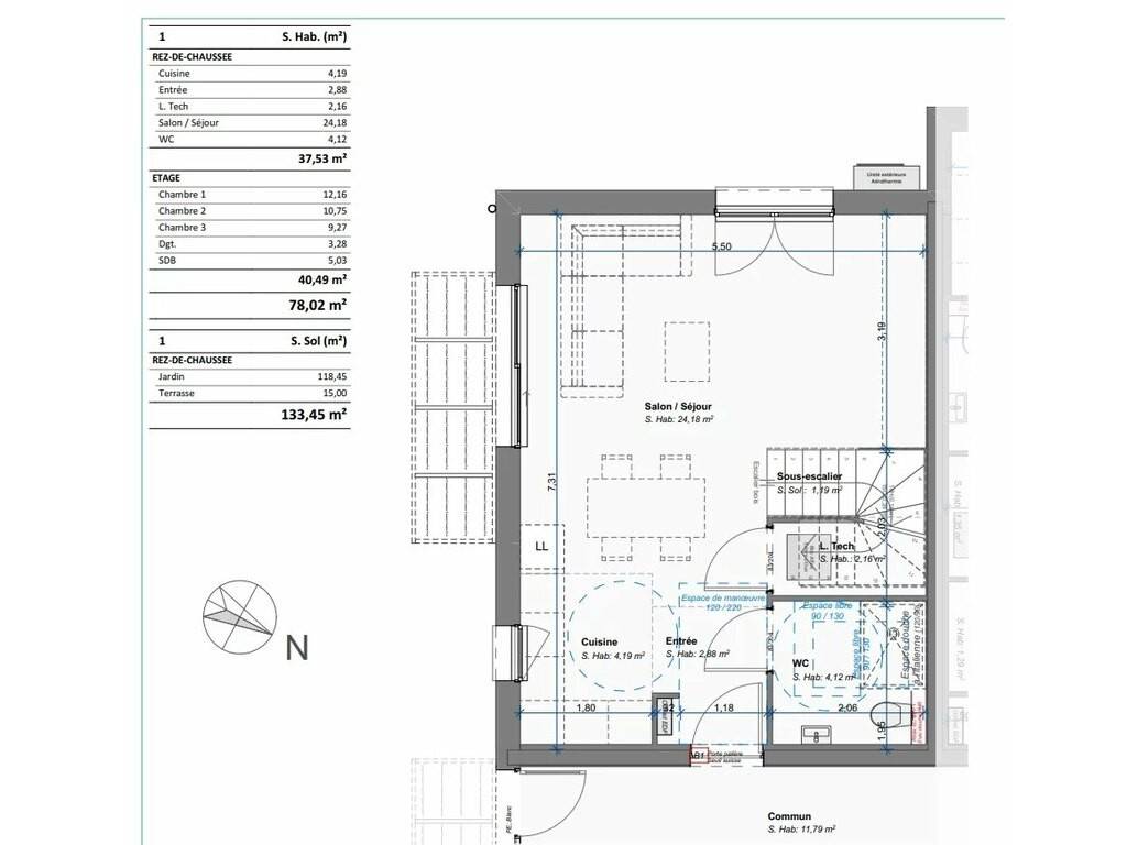 l'Immobilière Romain Thill Sàrl de Pétange en collaboration avec l'immobilière JOLIBOIS de Cosnes et Romain ont le plaisir de vous proposer . Cet appartement Duplex neuf situé à Lexy. Il se compose : D'une entrée de 2,88 m2 , d'une cuisine équipée de 4 m2 donnant sur la pièce de vie lumineuse 24 m2 avec accès à la terrasse en bois de 15 m2 et du jardin privatif de 118 m2, une toilette avec lavabo de 4 m2 (pouvant intégrer une douche). Un bel escalier bois distribuant la 1er chambre de 12,16 m2, la 2ème de 10,75 m2 et la 3ème de 9,27 m2, une salle de bains avec WC de 5,03 m2