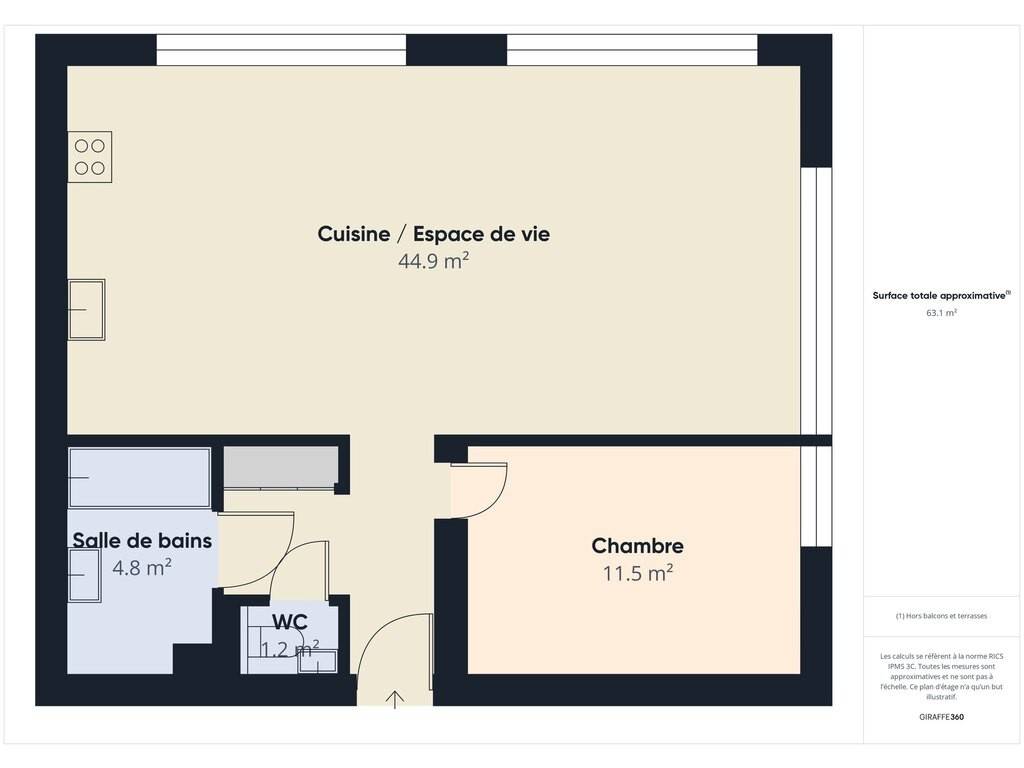Ce bien, construit en juin 2015, offre une surface habitable d'environ 64 m² comprenant une grande chambre, une salle de bains élégante, une cuisine équipée ouverte sur un salon lumineux orienté nord-ouest, garantissant une belle lumière naturelle tout au long de la journée.