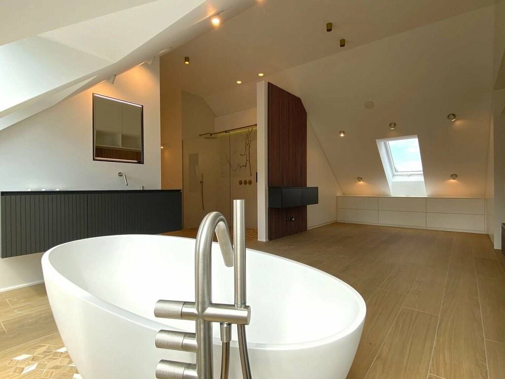 Somptueuse suite de ±50m², équipée d'une baignoire et d'une douche à l'italienne, avec de nombreux rangements et un WC indépendant.