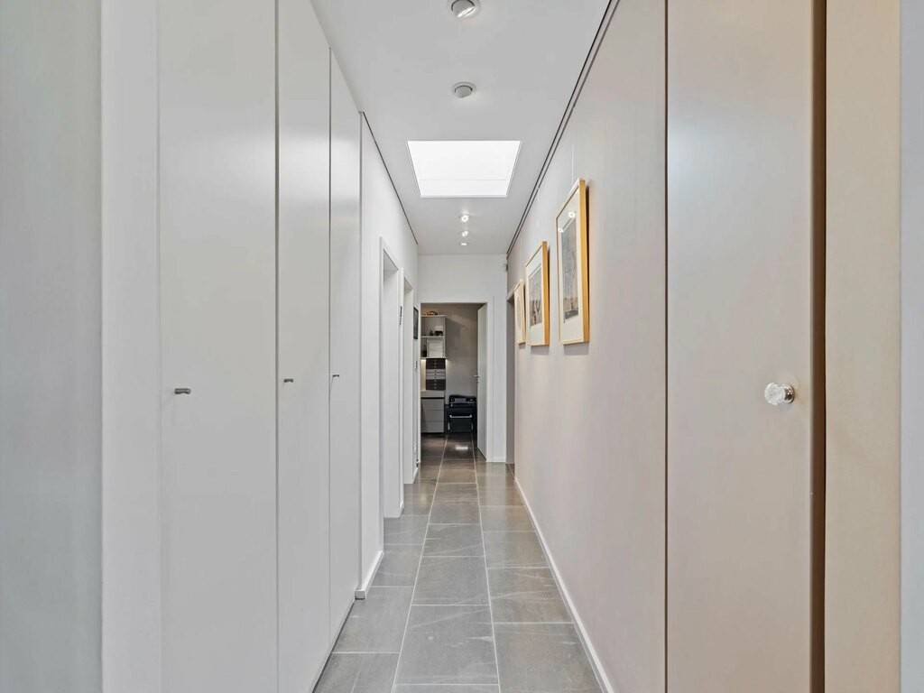 Der Zugang zur Etage im 6. Stock ist gesichert und privat. Vom Eingangsbereich gelangt man in den großzügigen Wohn- / Essbereich von ±62m² mit großen Fensterfronten, erweitert durch eine offene Küche von ±21m². Diese Wohnbereiche öffnen sich auf eine herrliche Terrasse von ±57m², teils überdacht mit einer Veranda und ausgestattet mit Markisen. Die Südwestausrichtung sorgt den ganzen Tag über für viel Licht. Auf der Westseite bieten Wohnzimmer und Terrasse einen freien Blick über den Park.