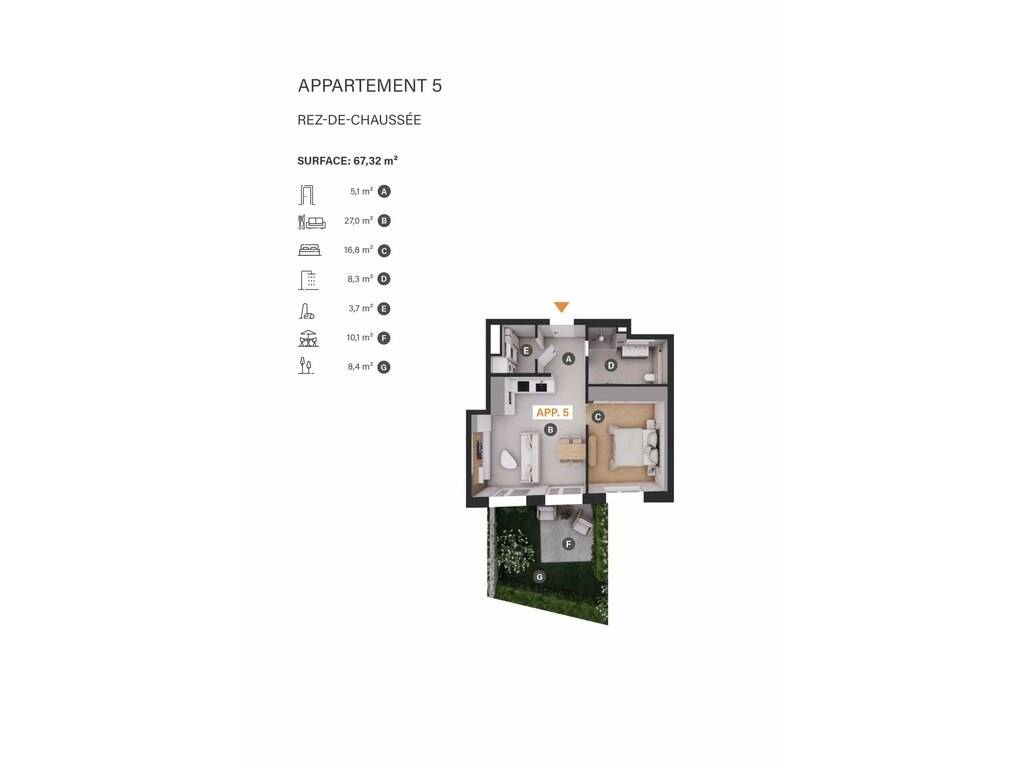 L'appartement N°5 se situe au rez-de-chaussée de la résidence et dispose d'une surface totale de 68m2 et profite d'une terrasse de 11 m2 et d'un jardin privatif de 9 m2.