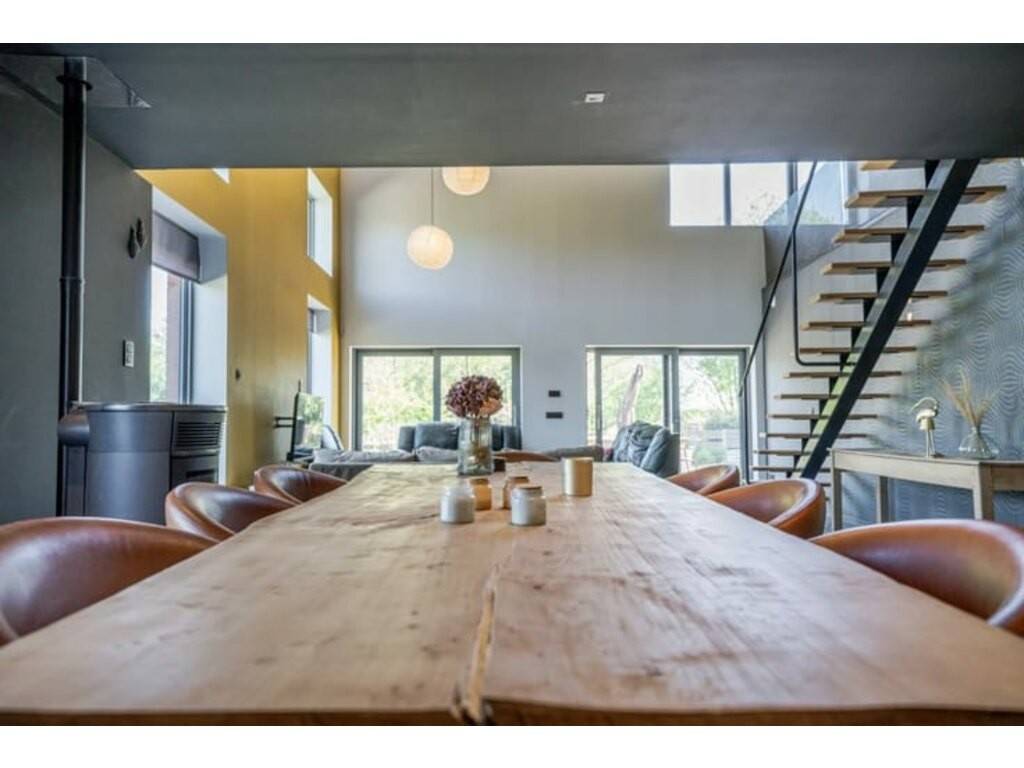 - Au rez-de-chaussée (PMR possible): Un hall d’entrée donnant sur un magnifique séjour "cathédrale" de +- 90m², une cuisine super-équipée, une suite parentale de 36 m², un bureau, deux buanderies, un double garage et local chaufferie.