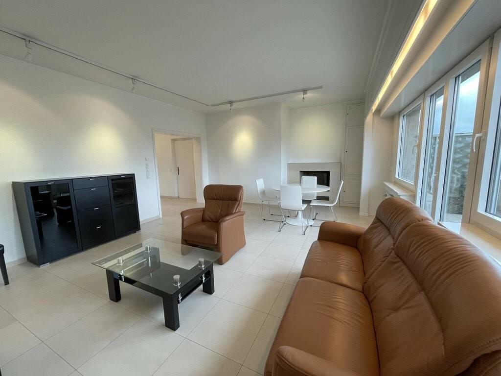 séjour lumineux avec beau feu ouvert et bibliothèque et accès à une grande terrasse avec vue imprenable sur le plateau du Kirchberg;