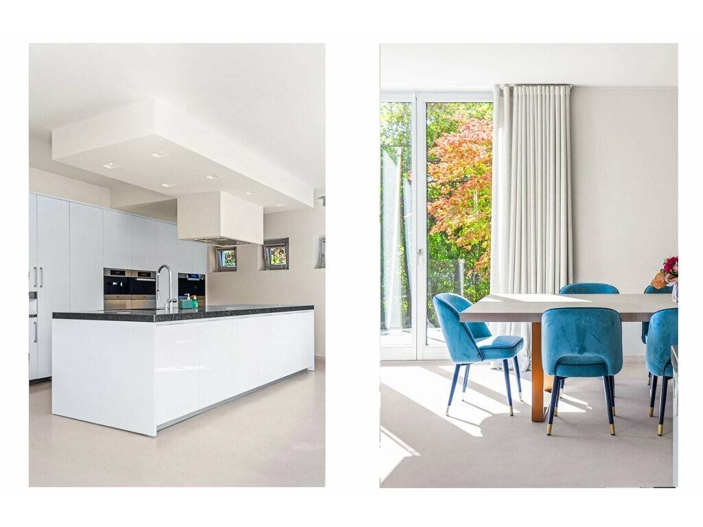 À l'intérieur, cette maison se distingue par l'utilisation de matériaux et de finitions nobles, de très haut standing, par ses beaux volumes, ses nombreux puits de lumières ainsi que par une majestueuse hauteur sous plafond de 4 mètres dans la spacieuse pièce de vie de ± 120 m² agréablement organisé en 3 zones.