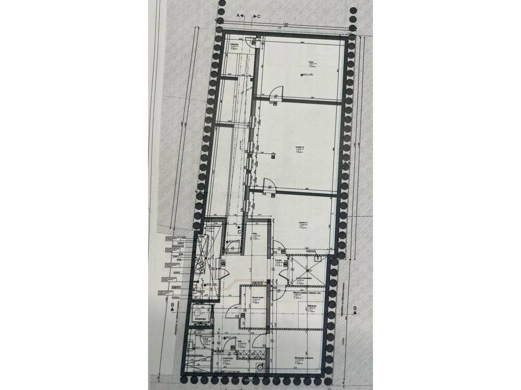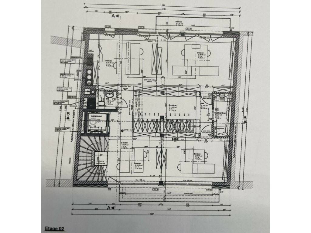 - 2ème étage: divers espaces de bureaux actuellement séparés par armoires/archives de construction légère facilement modifiables, WC séparé et cuisine/copy.