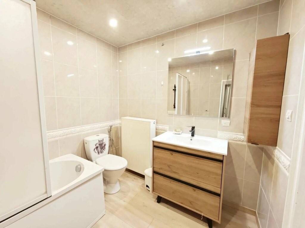 - Une salle de bain avec baignoire et toilette.