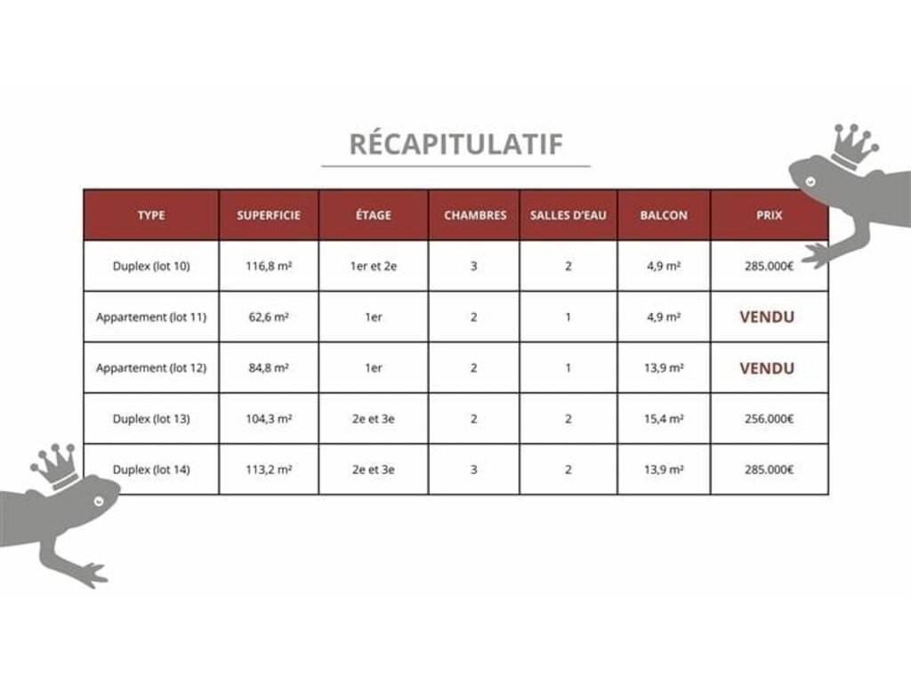 Ce duplex de 117 m² situé aux 1er et 2e étages de la partie neuve comprend un hall d'entrée, un séjour ouvert sur la cuisine, 3 chambres (18, 11 et 10 m²), 2 salles d'eau, 2 wc et une buanderie.