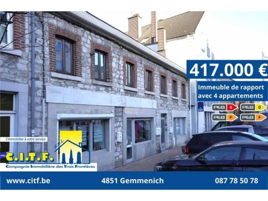Immeuble de rapport avec 4 appartements, sous caves, grenier, grand jardin au centre de La Calamine, Rue de Liège 188-190, proche des commodités (écoles, magasins, restaurants, centre médical, centre sportif, transports en commun, parkings publics), et des frontières allemande et hollandaise.
