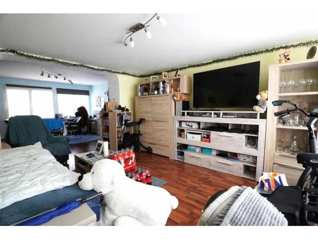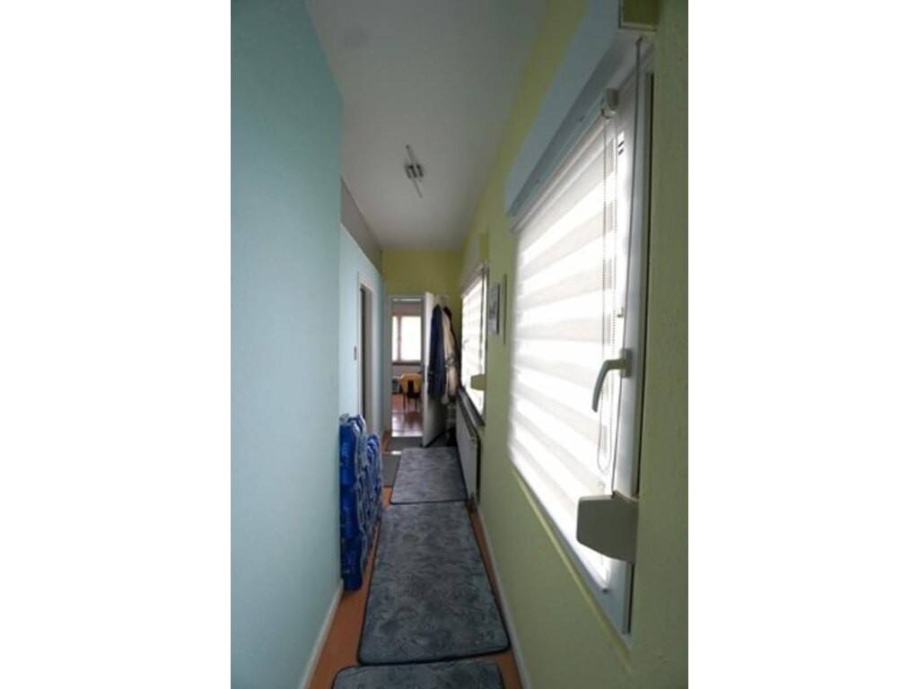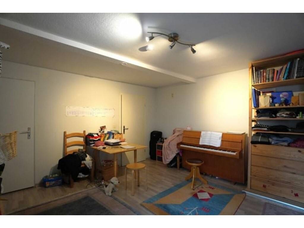 Séjour, cuisine équipée, hall de nuit, salle de bain avec douche et lavabo, wc séparé, une grande chambre avec accès à l’extérieur, 2° chambre avec coin vestiaire, buanderie avec 2° wc séparé et accès au sous-sol, cave privative + accès pour machine. Grand jardin!