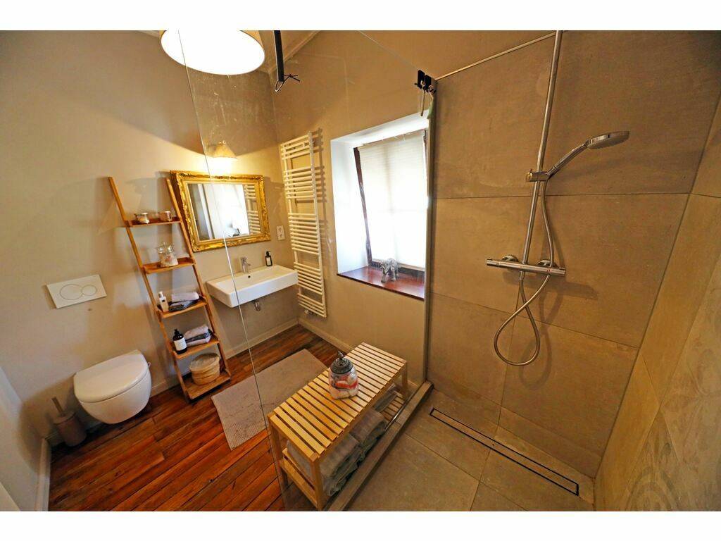 - Stilvoll renovéiert: al Elementer wéi zb Plättercher (Villeroy Boch), Hausdir an Gipselementer restauréiert an an d'Renovatioun integréiert. Verschidde Mauere mat Leem ausgefëllt.