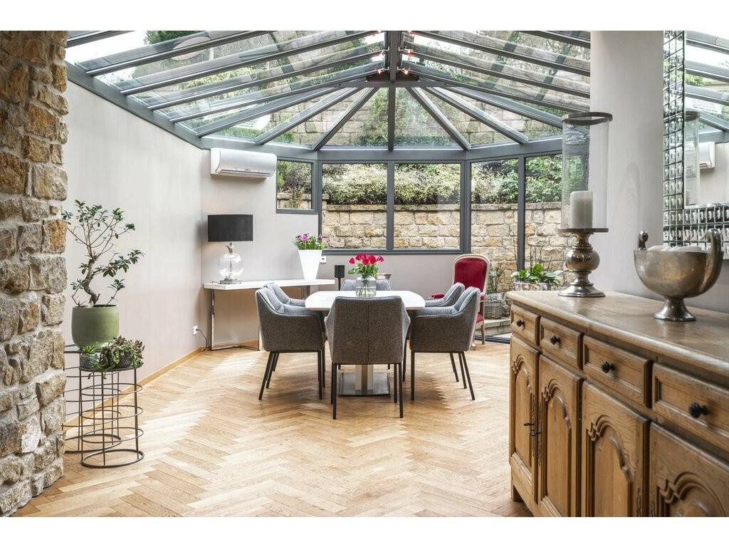 Les espaces de vie sont chaleureux et soigneusement aménagés. Le salon, habillé de pierre naturelle et d’un parquet massif, se prolonge vers une salle à manger élégante et une véranda plein est baignée de lumière. La cuisine ouverte offre un accès fluide aux terrasses et au jardin.