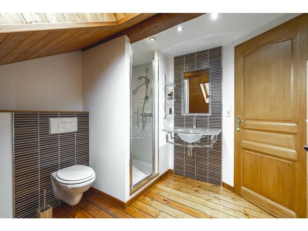 Les étages accueillent quatre chambres, dont une suite parentale sous combles, avec salle d’eau privative et volumes mansardés authentiques. Une autre salle d’eau et une toilette séparée complètent les prestations.