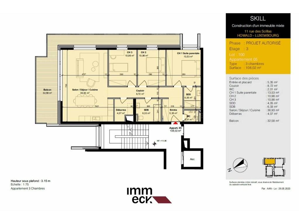 Un lumineux appartement (05) d'une superficie habitable de +/- 108,02 m2 et d'un balcon de +/- 32,58 m2, avec trois chambres à coucher.