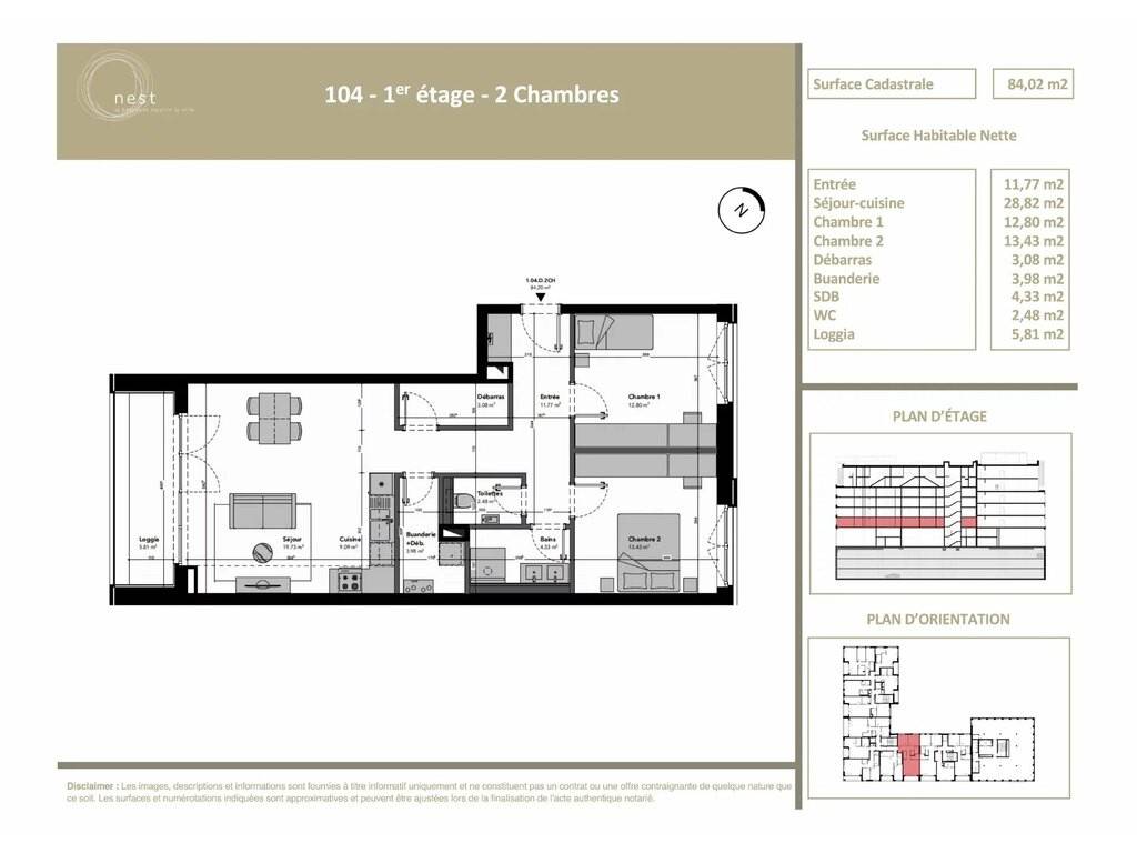 L'appartement Lot 1.04.D.2CH situé au 1er étage et a une superficie cadastrale de ±84,02m², une loggia de ±5,81m², et est divisé comme suit :
