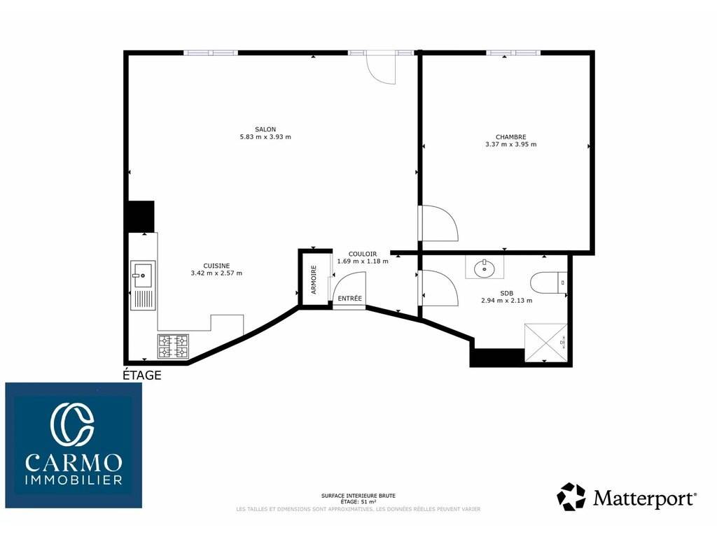 Le séjour-cuisine de 28,8 m², lumineux et orienté plein sud, s’ouvre sur une terrasse de 3,9 m² idéale pour les moments de détente. La chambre de 13,1 m² offre une belle surface de rangement. La salle de douche avec WC totalise 5,2 m², complétée par un hall d’entrée de 1,8 m² et un débarras de 0,5 m² pour un intérieur parfaitement fonctionnel. Les sols en carrelage facilitent l’entretien. En sous-sol, une cave privative de 3,2 m² et une buanderie commune avec branchement pour votre machine optimisent l’organisation. La résidence dispose de la fibre optique, de volets roulants électriques, d’un interphone et d’un chauffage collectif au gaz.
