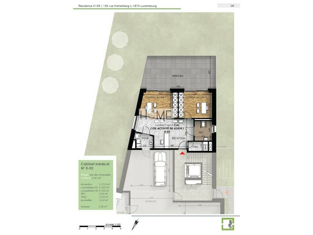 Caractéristiques du Lot 2 : Hall d'entrée avec espace réception 2 salles de consultation ou bureaux WC séparé Débarras (VMC) + accès local poubelles Grande terrasse privative de 35 m²