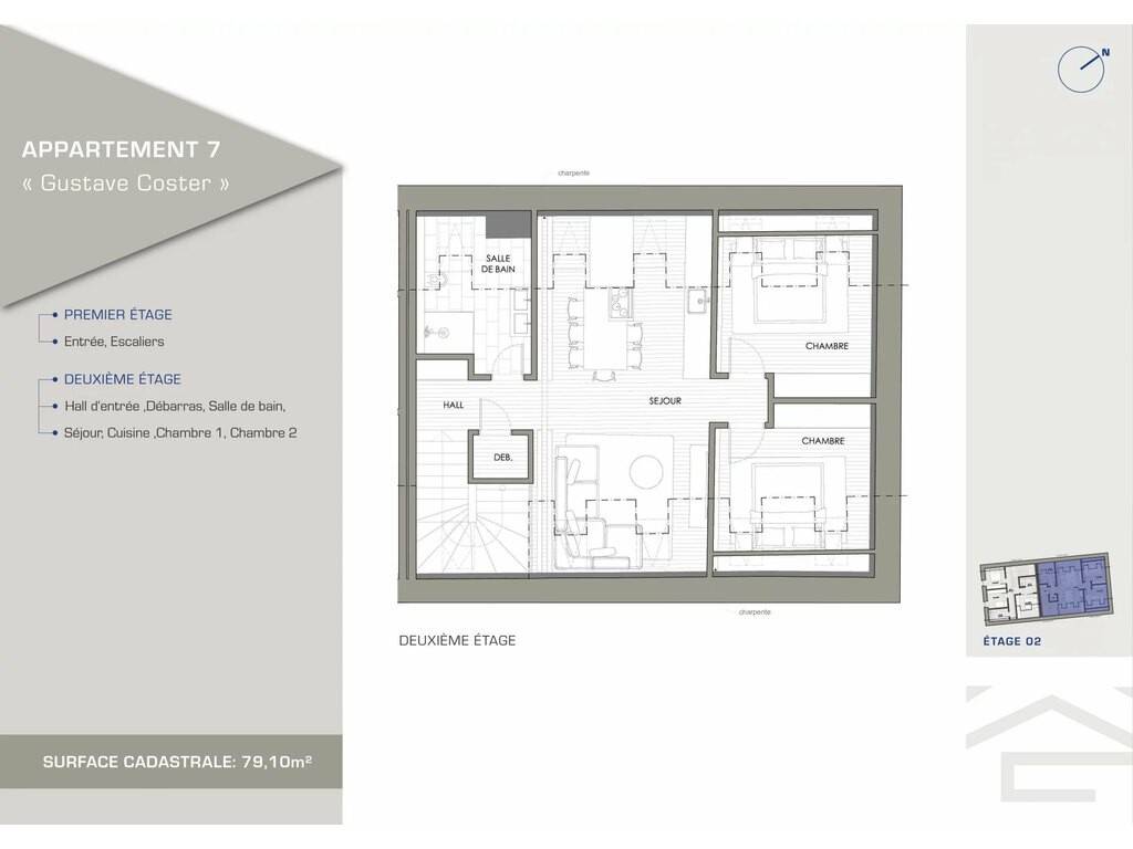 2e étage : Hall, débarras, salle de bain, séjour, cuisine et deux chambres spacieuses.