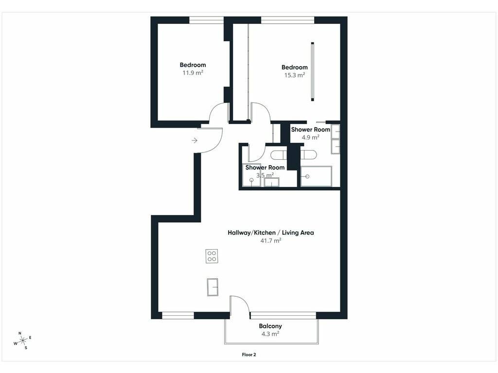 Layout: living room/dining room/kitchen (41.7 sqm) opening onto the balcony (4.3 sqm) - bedroom (11.9 sqm) - master bedroom (15.3 sqm) with en-suite shower room and WC (4.9 sqm) - shower room with WC (3.5 sqm)
