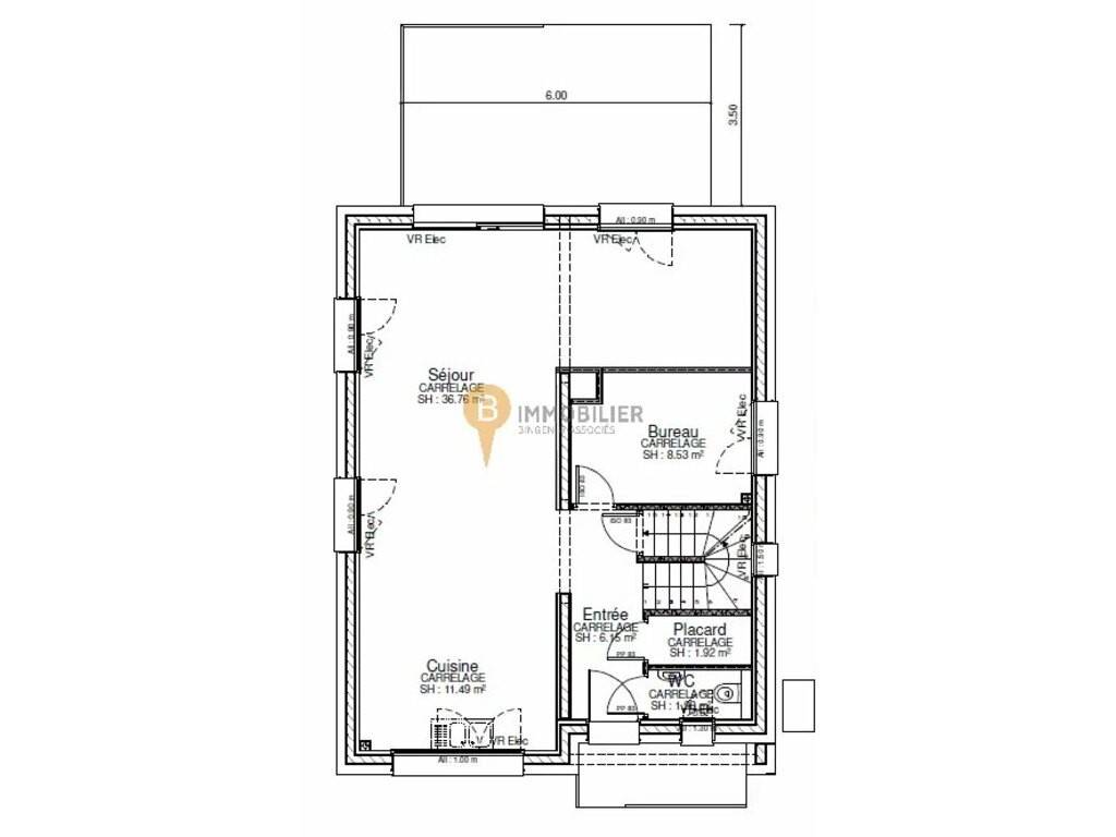 • Au rez-de-chaussée : un hall d’entrée avec placard mène à un vaste espace living/cuisine de 49 m², un bureau et un WC. • À l’étage : 3 chambres lumineuses et une salle de bains.