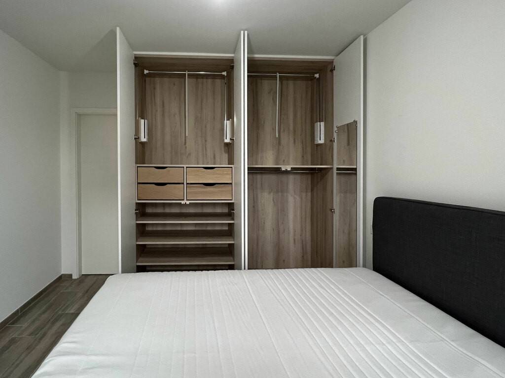 Hall d'entrée avec un placard encastré, WC séparé, living ouvert sur cuisine entièrement équipée avec accès sur balcon. Débarras avec machine à laver et sèche-linge. Grande chambre à coucher avec salle de douche.