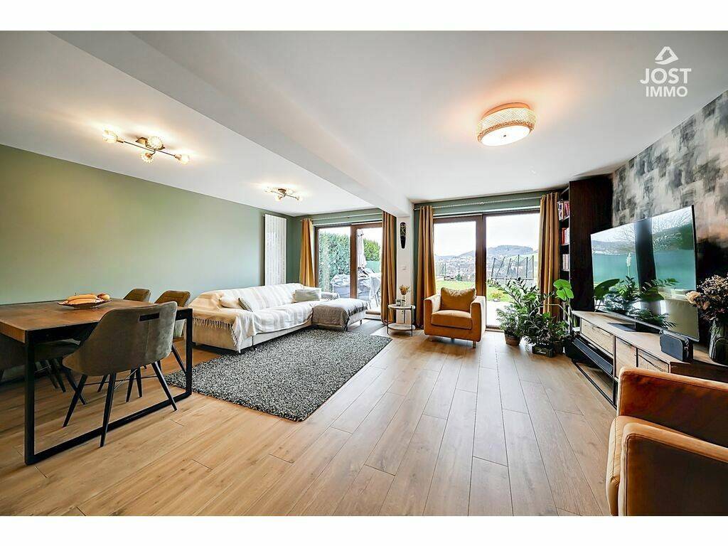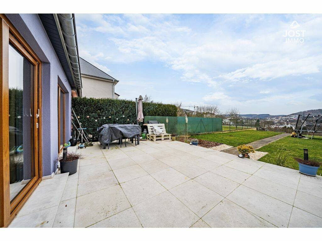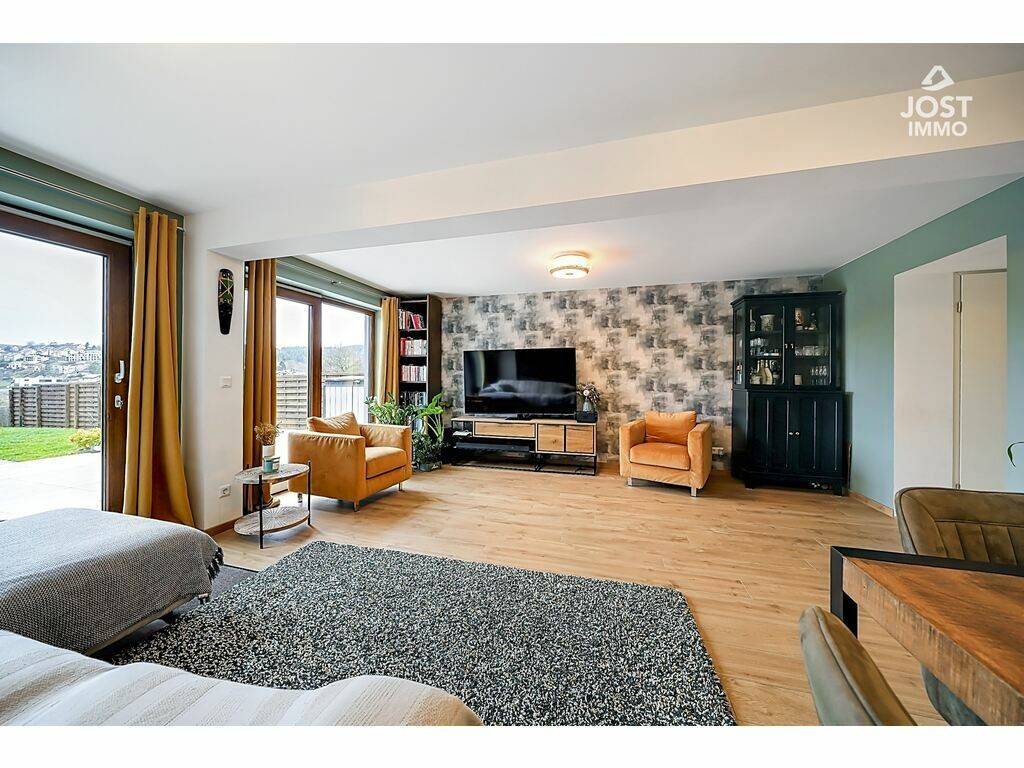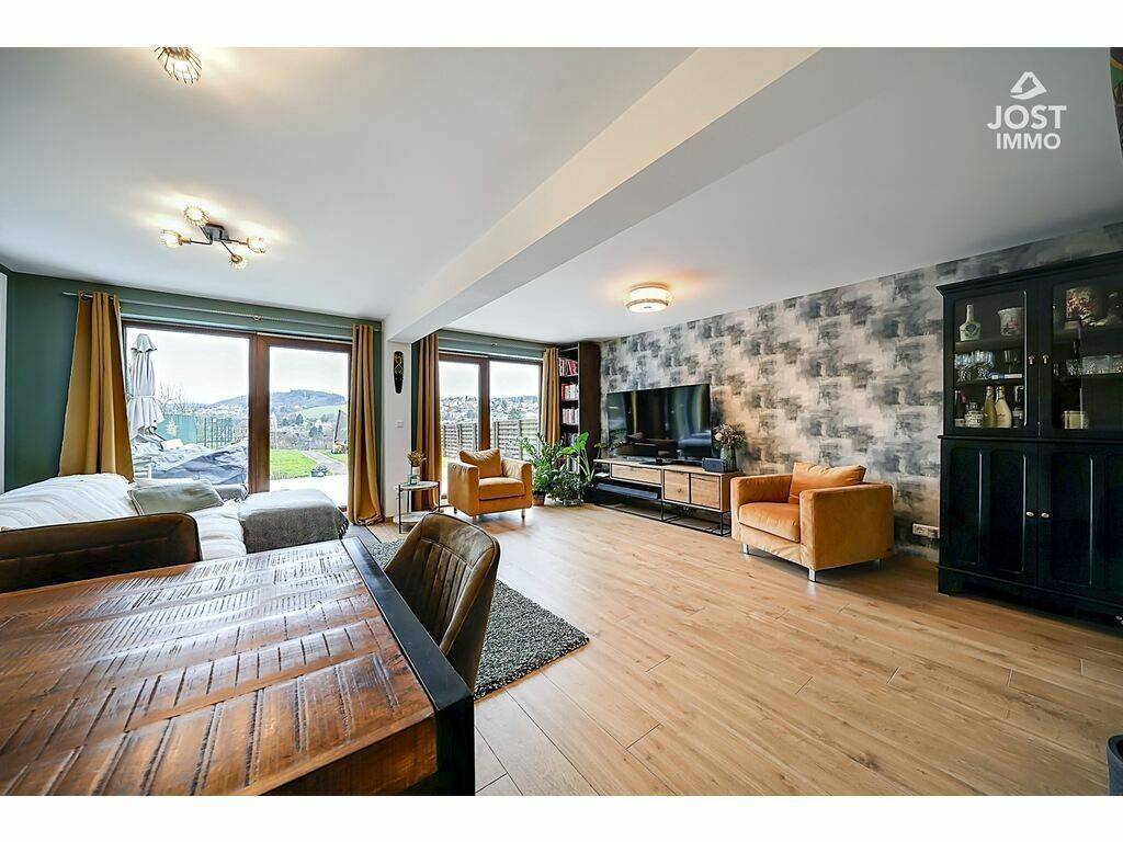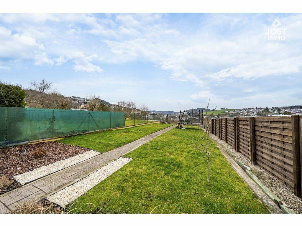 Son véritable coup de cœur réside dans ses extérieurs : une magnifique terrasse d’environ 30 m² prolongée par un jardin d’environ 181 m², offrant une vue panoramique exceptionnelle sur Wiltz. Un décor unique pour profiter pleinement du soleil de l’après-midi et savourer des couchers de soleil à couper le souffle, dans un calme absolu.