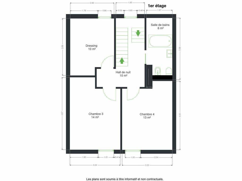 Un hall de nuit dessert deux chambres supplémentaires (13 m² et 14 m²), une salle de bain et un dressing, offrant un espace nuit confortable et bien structuré.