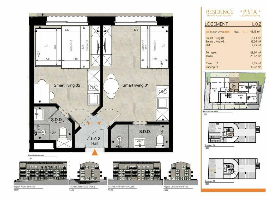 Situé au rez-de-chaussée de la résidence contemporaine PISTA, l’appartement L.0.2 développe une surface habitable d’environ 43,13 m², prolongée par de beaux espaces extérieurs privatifs.