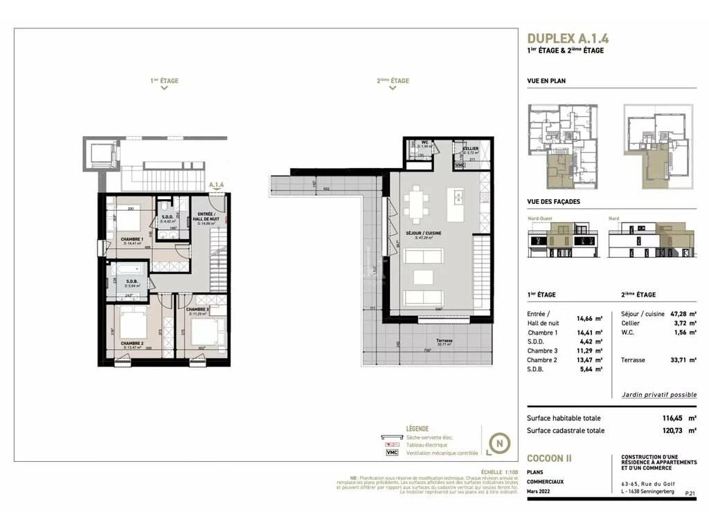 Situé au premier et deuxième étage, ce penthouse trois chambres à coucher dispose d'une surface cadastrale de 120,79 m2 et d'une grande terrasse de 33,71 m2 au dernier. Ce magnifique appartement disposera d'un emplacement de stationnement en sous-sol et d'une cave.