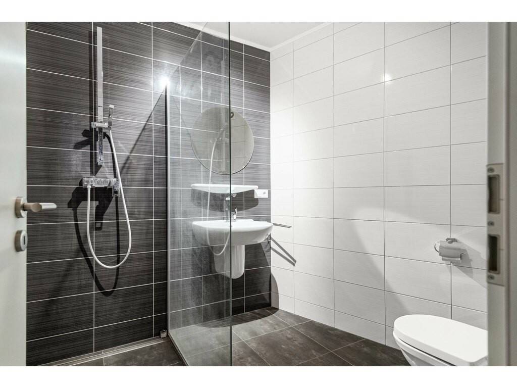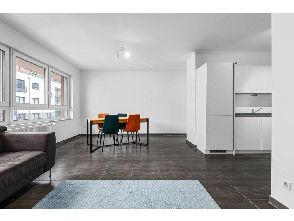 Un hall de ± 4m², un séjour de ± 25m² ouvert sur une cuisine équipée de ± 6m², un débarras de ±2m², une une chambre de ±19 avec une salle de douche (douche, lavabo, VMC, WC) de ± 5m² ainsi que d'un WC séparé de ± 2m² et un balcon de ± 3m².