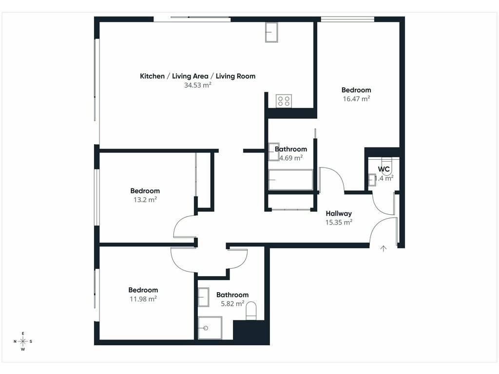 Layout: Entrance hall with custom-made closet (15.3 sqm), separate WC (1.4 sqm), living room / kitchen / dining area with access to the large terrace and shared garden with open views (34.5 sqm), master bedroom (16.5 sqm) with en-suite bathroom including vanity unit and additional storage (4.7 sqm), bedroom with terrace access and full-height custom closet (13.2 sqm), bedroom with terrace access (12 sqm), shower room with vanity unit and WC (5.8 sqm)