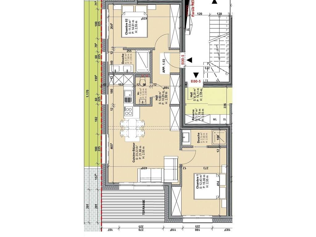 Au 1er étage l'appartement 103 comprend un hall d'entrée, un WC séparé, deux chambres à coucher, deux salle de douche, ainsi qu'une cuisine ouverte sur le séjour avec accès à une terrasse, complétant cet espace.