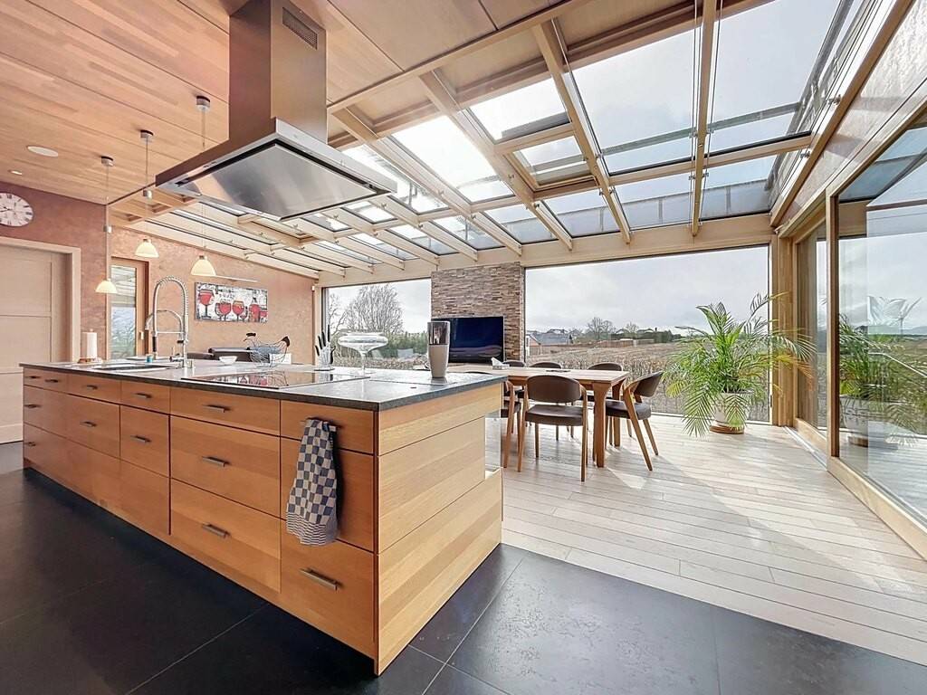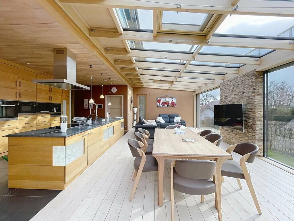 Un élégant escalier en bois mène à l’étage principal offrant environ 219m² habitables. On y découvre un vaste espace salon et salle à manger avec cuisine équipée haut de gamme comprenant notamment four, micro-ondes, four vapeur et machine à café intégrée. Juste derrière la cuisine se trouve un débarras pratique offrant un espace de rangement supplémentaire. Les larges baies vitrées créent une atmosphère lumineuse exceptionnelle et permettent un accès direct à la terrasse équipée d’une marquise ainsi qu’à l’espace extérieur avec vue dégagée sur la verdure. Une seconde grande salle à manger, un bureau avec installation musicale intégrée, deux chambres confortables ainsi qu’une salle de bains supplémentaire complètent cet étage.