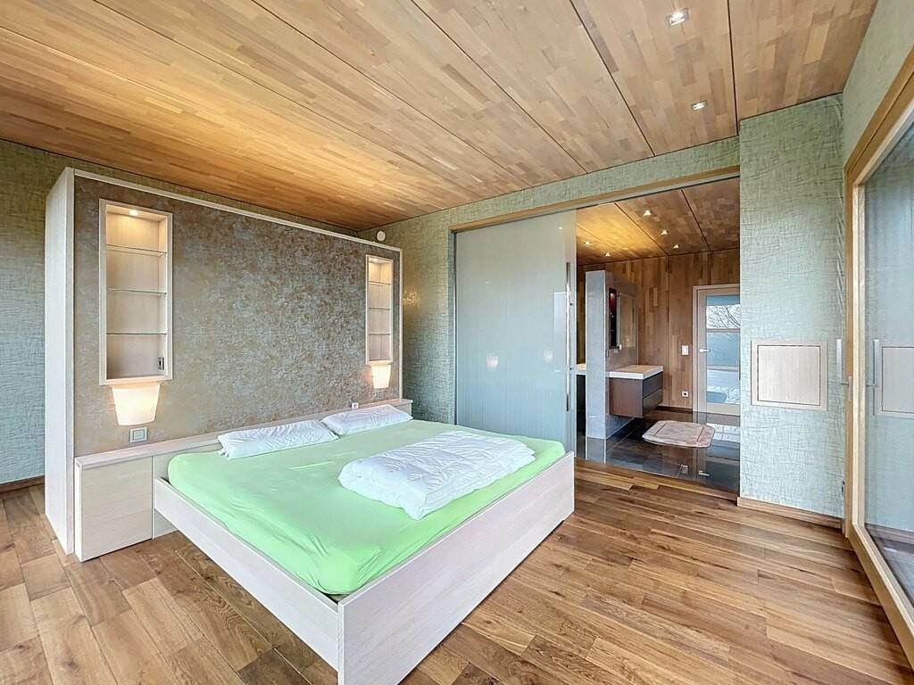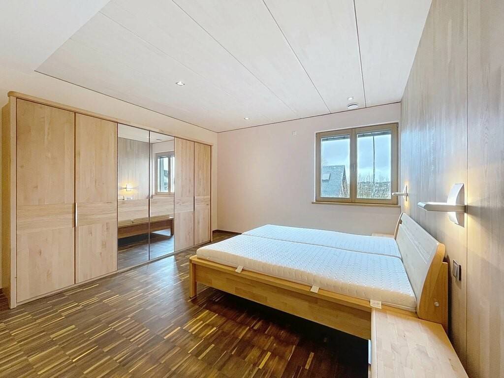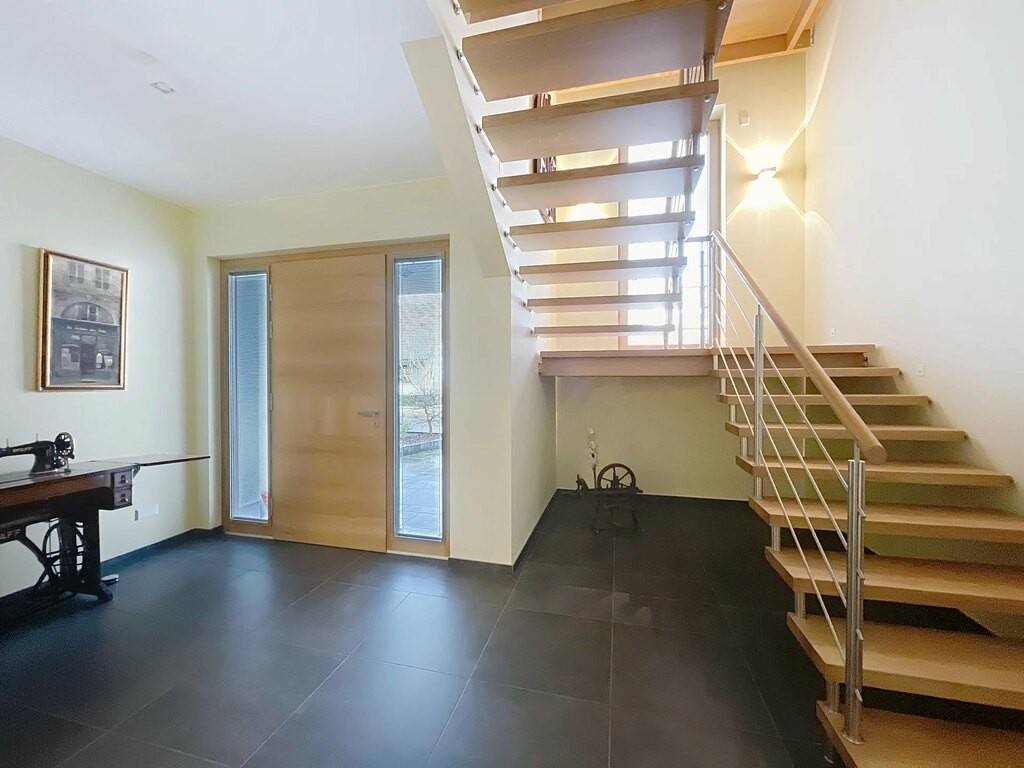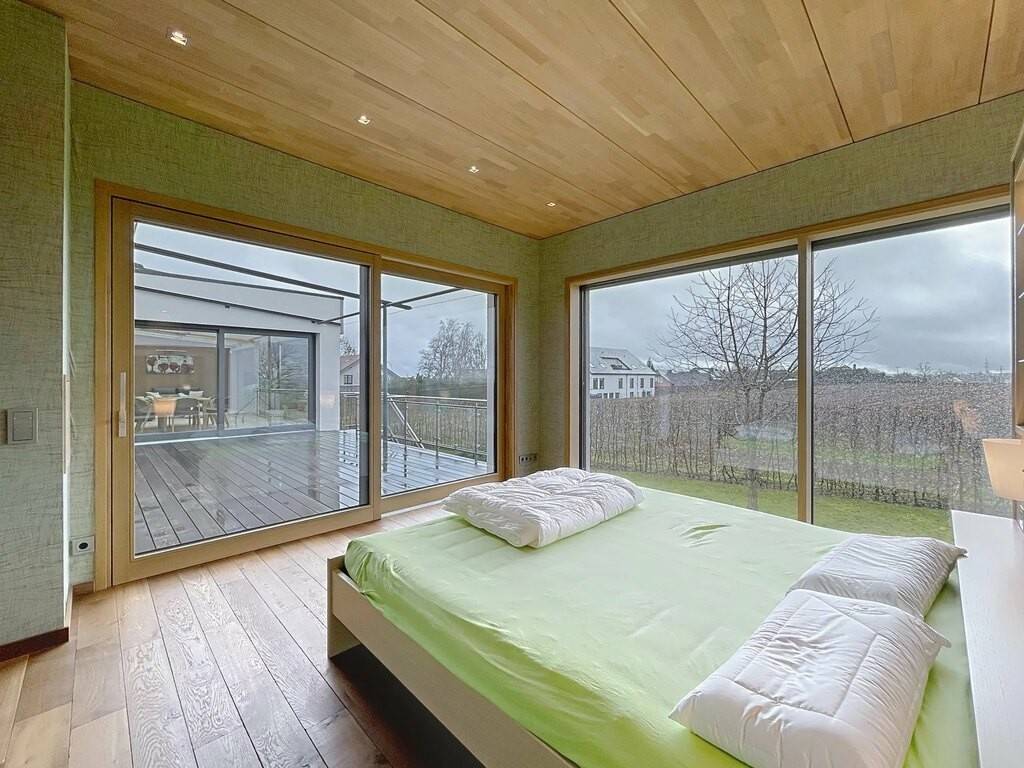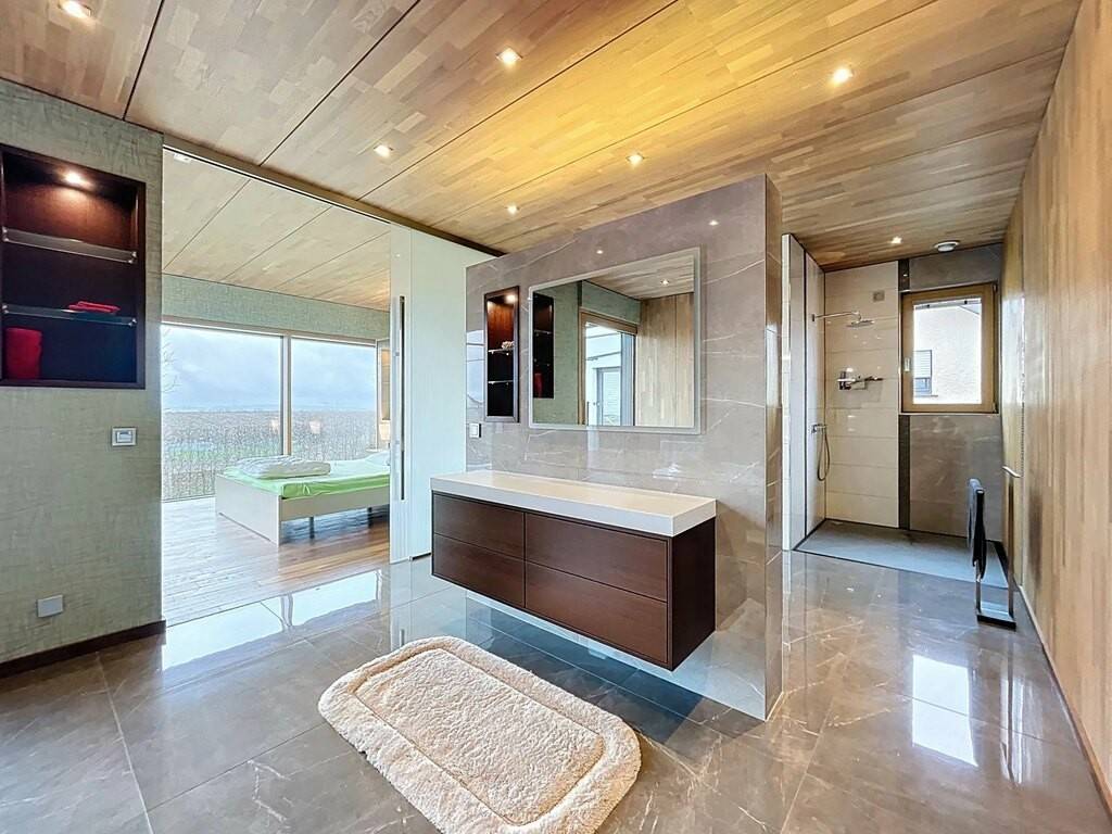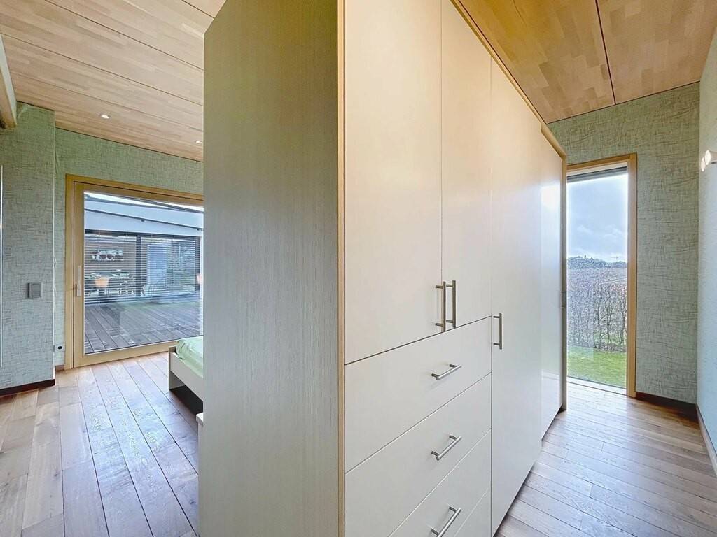 Des équipements techniques modernes tels que le chauffage au sol, une installation géothermique combinée à des panneaux photovoltaïques et solaires, un système d’aspiration centralisée ainsi que des fenêtres en chêne triple vitrage soulignent le standing élevé et l’efficacité énergétique du bien. Les fenêtres du séjour, de la cuisine et de la chambre parentale sont équipées de stores à lamelles orientables, tandis que les autres pièces disposent de stores intégrés dans le vitrage ainsi que de volets roulants électriques assurant confort, intimité et protection solaire optimale. Des portes intérieures massives en chêne apportent une touche supplémentaire d’élégance à l’ensemble.