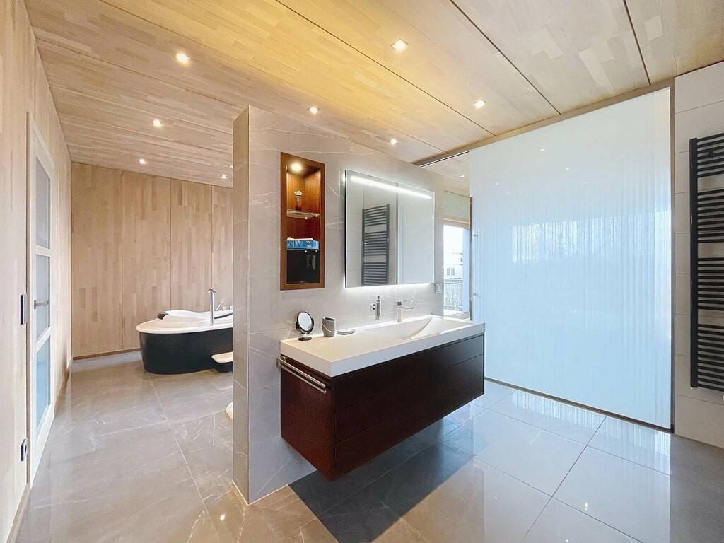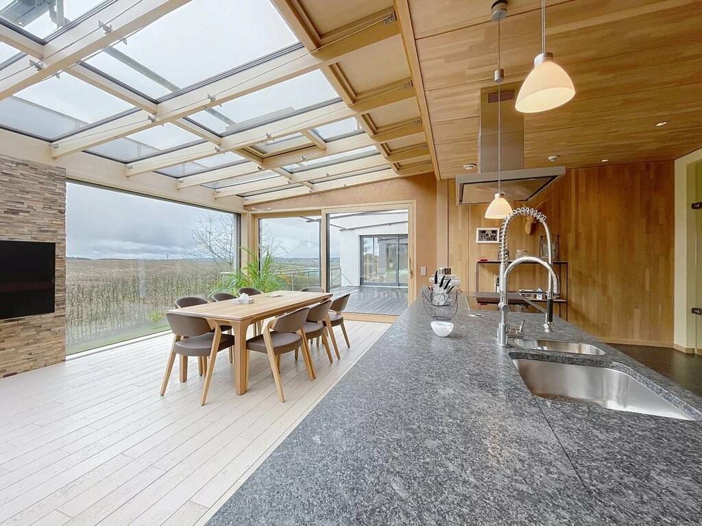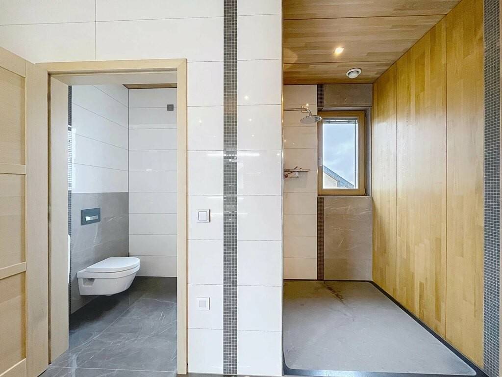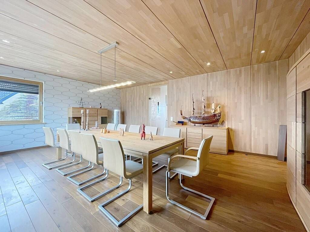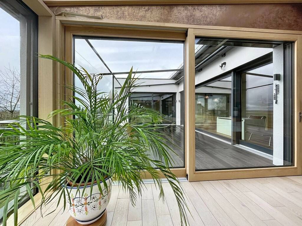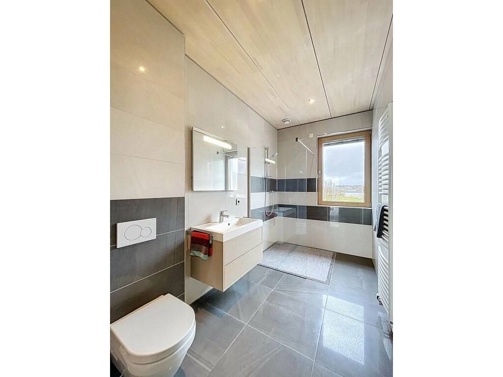 Des équipements techniques modernes tels que le chauffage au sol, une installation géothermique combinée à des panneaux photovoltaïques et solaires, un système d’aspiration centralisée ainsi que des fenêtres en chêne triple vitrage soulignent le standing élevé et l’efficacité énergétique du bien. Les fenêtres du séjour, de la cuisine et de la chambre parentale sont équipées de stores à lamelles orientables, tandis que les autres pièces disposent de stores intégrés dans le vitrage ainsi que de volets roulants électriques assurant confort, intimité et protection solaire optimale. Des portes intérieures massives en chêne apportent une touche supplémentaire d’élégance à l’ensemble.