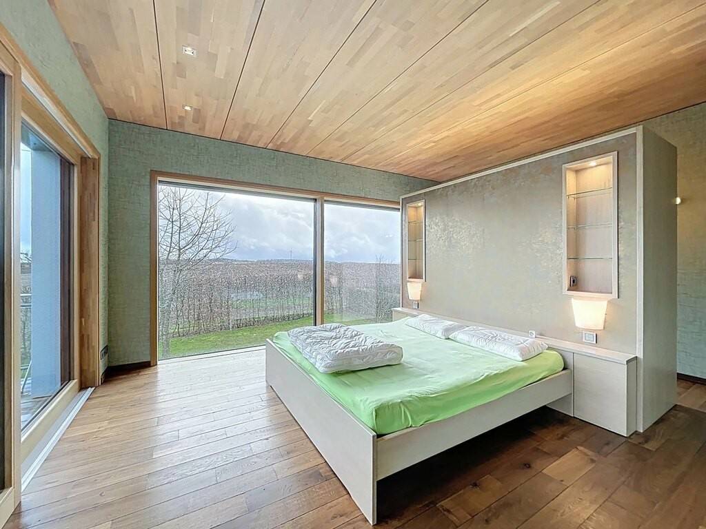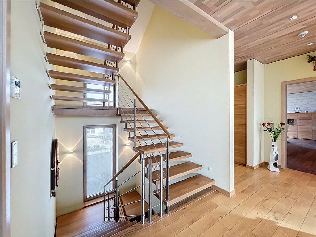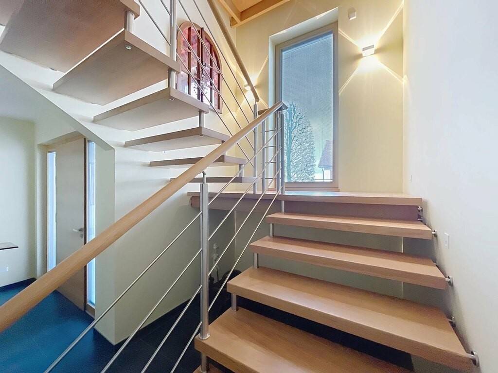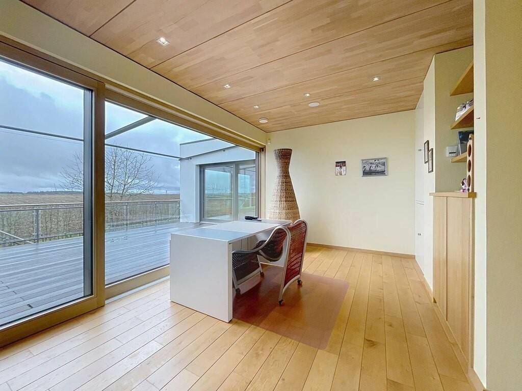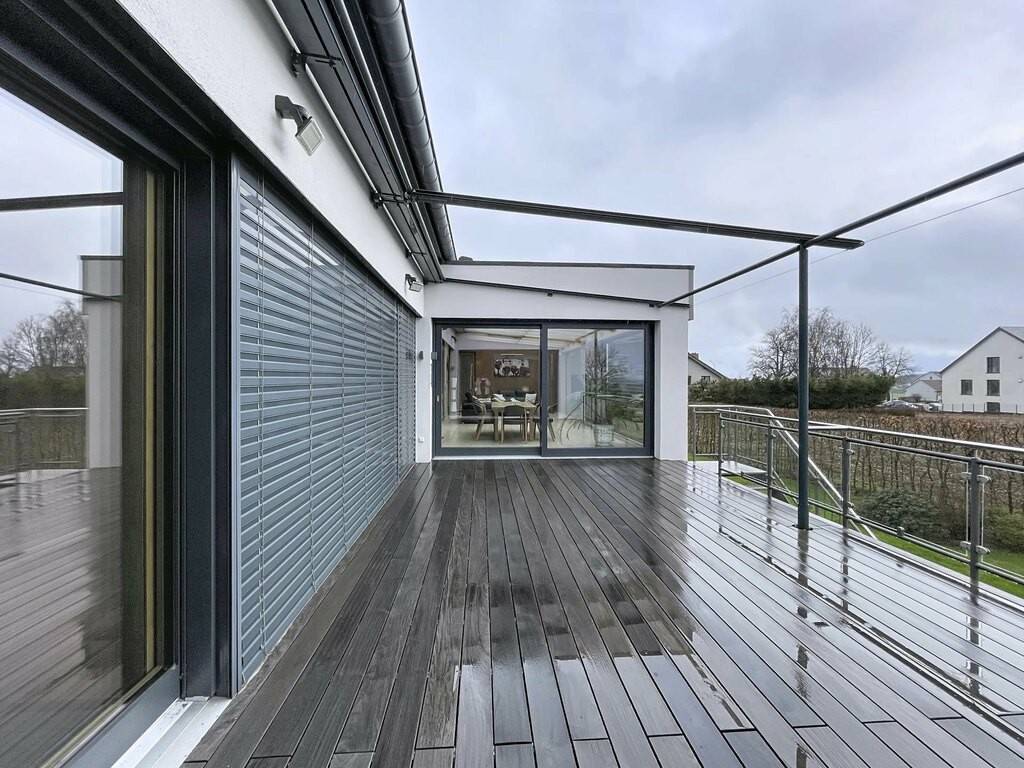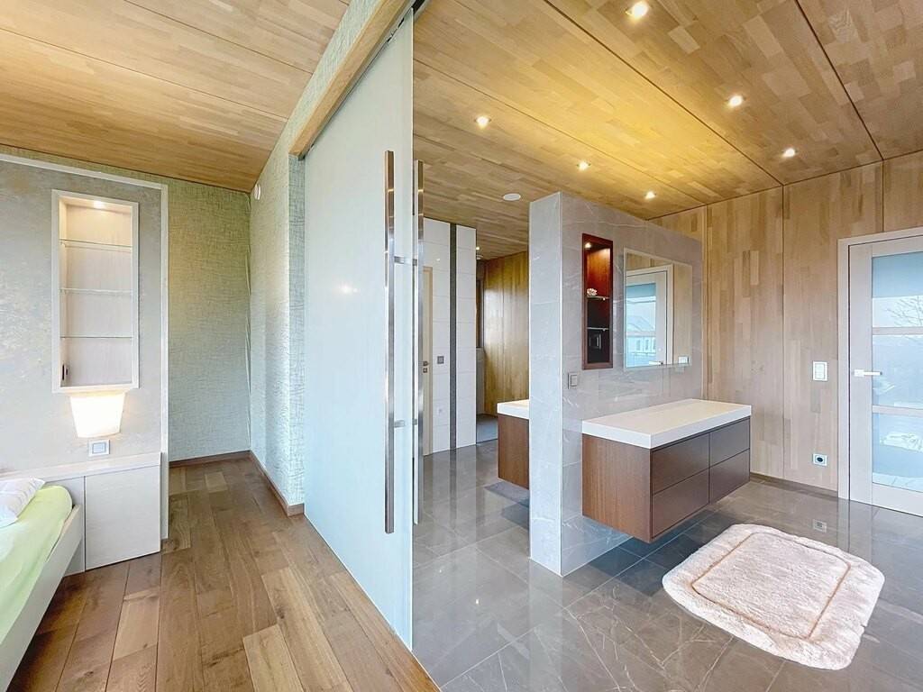 Des équipements techniques modernes tels que le chauffage au sol, une installation géothermique combinée à des panneaux photovoltaïques et solaires, un système d’aspiration centralisée ainsi que des fenêtres en chêne triple vitrage soulignent le standing élevé et l’efficacité énergétique du bien. Les fenêtres du séjour, de la cuisine et de la chambre parentale sont équipées de stores à lamelles orientables, tandis que les autres pièces disposent de stores intégrés dans le vitrage ainsi que de volets roulants électriques assurant confort, intimité et protection solaire optimale. Des portes intérieures massives en chêne apportent une touche supplémentaire d’élégance à l’ensemble.
