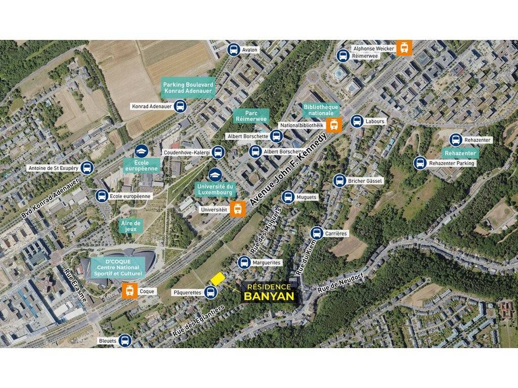 Situé dans un environnement résidentiel paisible et verdoyant, la résidence « Banyan » à 83 –91, rue des Muguets bénéficie d'un emplacement stratégique à Luxembourg-Weimershof, à la frontière immédiate du Kirchberg. Ce quartier calme et recherché séduit par sa qualité de vie, tout en offrant un accès immédiat aux infrastructures les plus modernes de la capitale. La résidence sera implantée sur un terrain de ca. 19,60 ares.