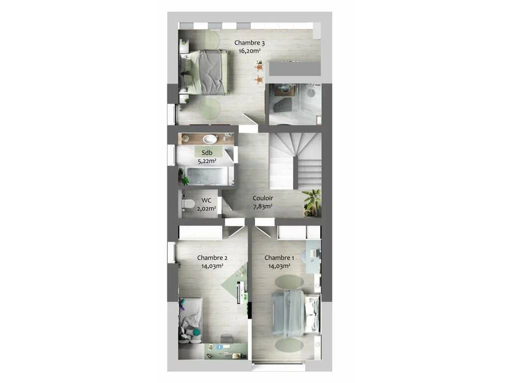 Au rez-de-chaussée, un hall d’entrée mène vers une lumineuse pièce de vie composée d’une cuisine ouverte et d’un spacieux séjour de 45,87 m². Cet espace convivial s’ouvre directement sur la terrasse et le jardin, créant une belle continuité entre intérieur et extérieur. Un débarras ainsi qu’un WC séparé complètent ce niveau.