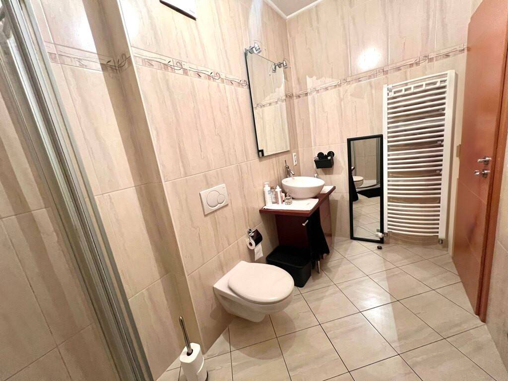 Cet appartement se compose comme suit: - Une terrasse couverte de 14m2 nous donne accès à l'entrée privative. A l'intérieur vous serez comblé par une pièce de vie avec 29m2 comprenant une large cuisine totalement équipée donnant sur salon hyper lumineux. - Une belle chambre avec accès à une vaste salle de douche. Une cave de 5,5m2 et un emplacement de parking extérieur privatif s'ajoutent à cette offre. En plus une buanderie commune, un local vélos / poussettes et un local de stockage.