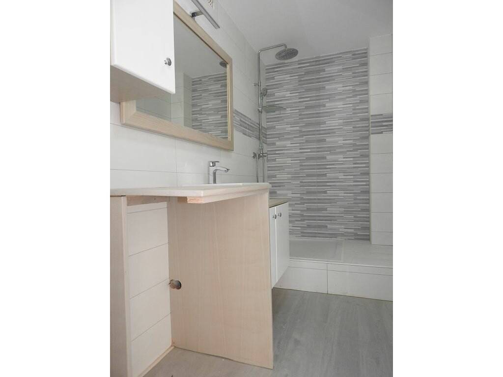 Une salle d'eau spacieuse avec douche, vasque meublée et emplacement machine à laver et un WC séparé.