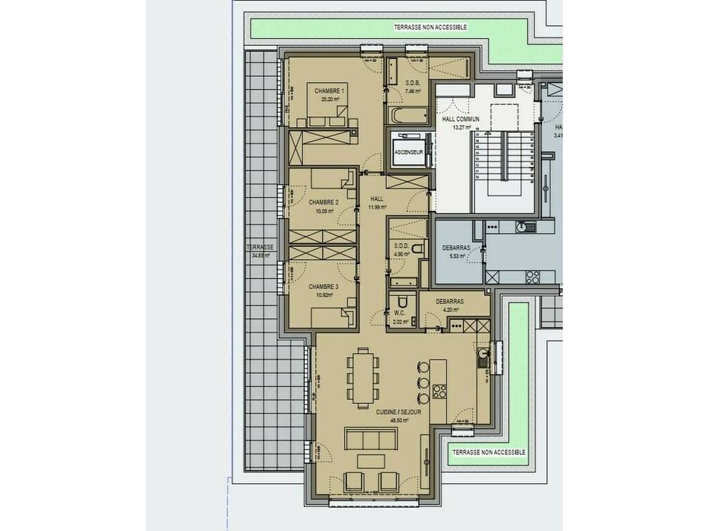 Le penthouse se situe au 3e et dernier étage et se compose d'un hall d'entrée avec un coin vestiaire, un WC séparé, une cuisine ouverte sur le séjour avec un spacieux débarras et une magnifique terrasse avec une vue dégagée faisant 34,85m2. Deux grandes chambres à coucher, une salle de de bains ainsi qu'une suite parentale avec un dressing et une salle de bains privative complètent cet appartement.