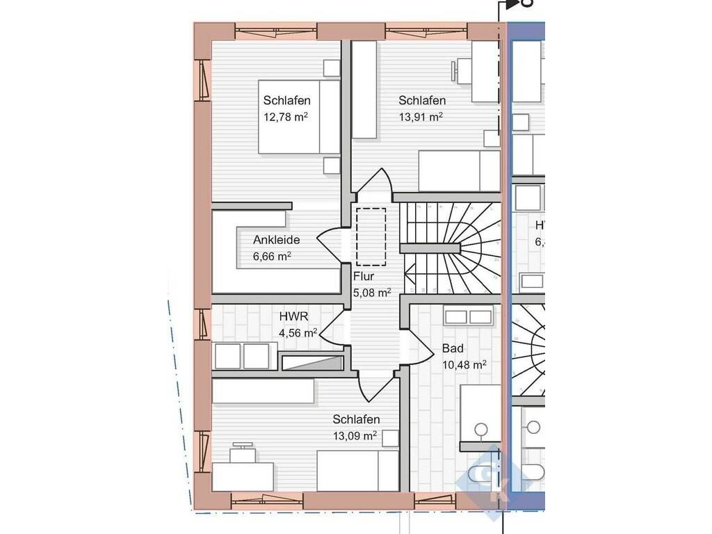 - 2ème étage : hall de nuit (5,08 m²), chambre avec dressing (19,44), deux autres chambres (13,91 et 13,09 m²), salle de bains (10,48 m²), buanderie (4,56 m²)