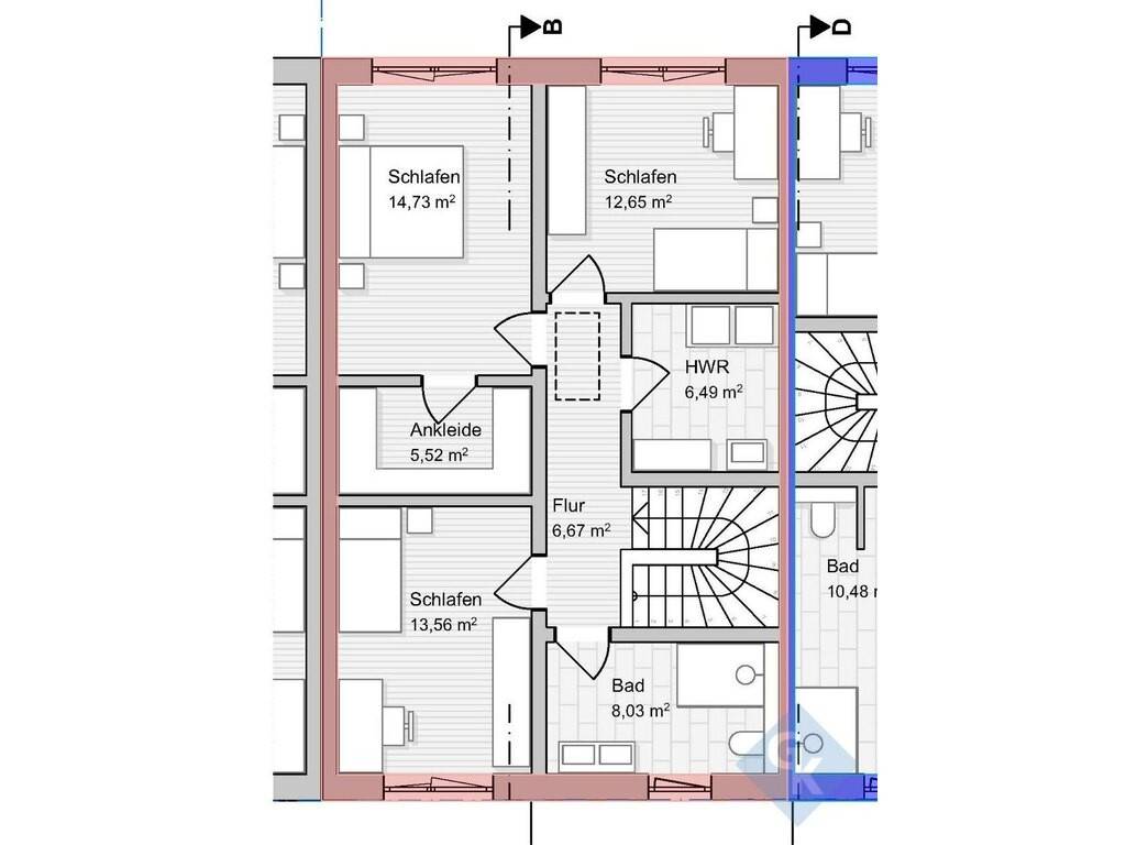 - 2ème étage : hall de nuit (6,67 m²), chambre avec dressing (20,25), deux autres chambres (13,56 et 12,65 m²), salle de bains (8,03 m²), buanderie (6,49 m²)