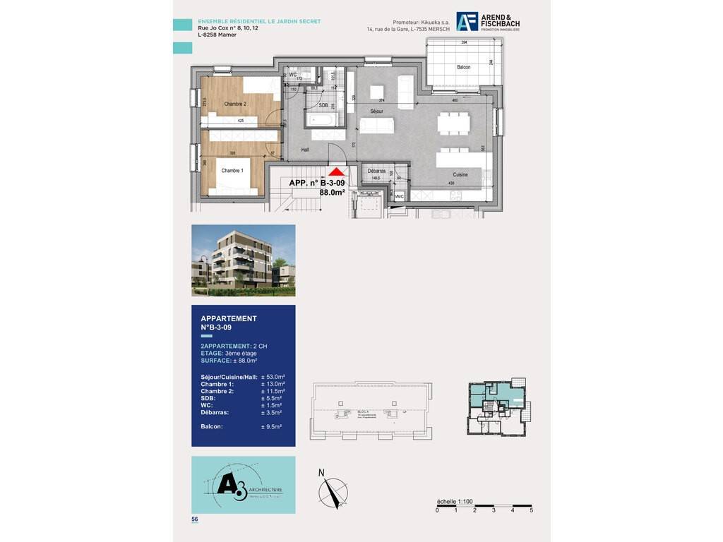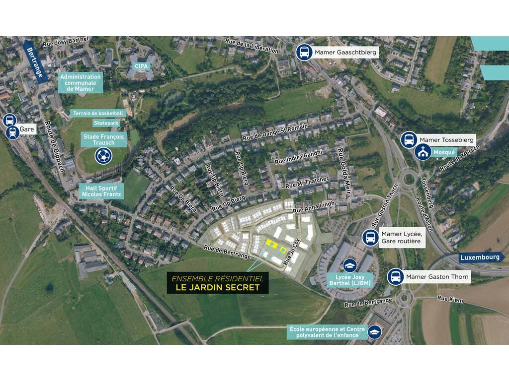 L'ensemble résidentiel « LE JARDIN SECRET » se situe dans le nouveau lotissement « Wëltgebond » à Mamer, 8–12, rue Jo Cox. Elle sera implantée sur un terrain de ca. 20,09 ares.